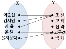 X의 이순신, 김시민, 권율이 Y의 조선에 대응해요. 거꾸로 보면 Y의 조선은 X의 이순신, 김시민, 권율 세 명과 대응하죠.