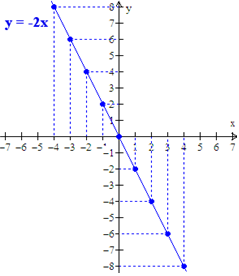 이번에는 y = -2x의 그래프를 그려보죠. 마찬가지로 순서쌍을 만들고 그 순서쌍을 좌표평면에 찍어서 나타내요. (-3, 6), (-2, 4), (-1, 2), (0, 0), (1, -2), (2, -4), (3, -6)