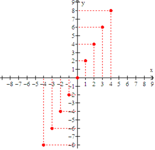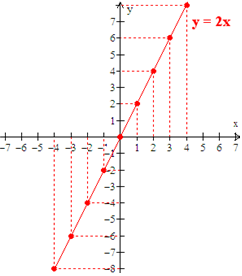 y = 2x가 있을 때, (-3, -6), (-2, -4), (-1, -2), (0, 0), (1, 2), (2, 4), (3, 6) 같은 순서쌍을 만들 수 있어요. 이 순서쌍들을 좌표평면에 나타내 보면 아래 그림처럼 되지요.