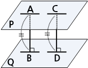 평행한 두 평면 중 한 평면 위의 점에서 다른 평면에 그은 수선의 길이를 평행한 두 평면 P, Q 사이의 거리라고 하고, 이 거리는 두 평면 사이 어디에서든 일정해요.